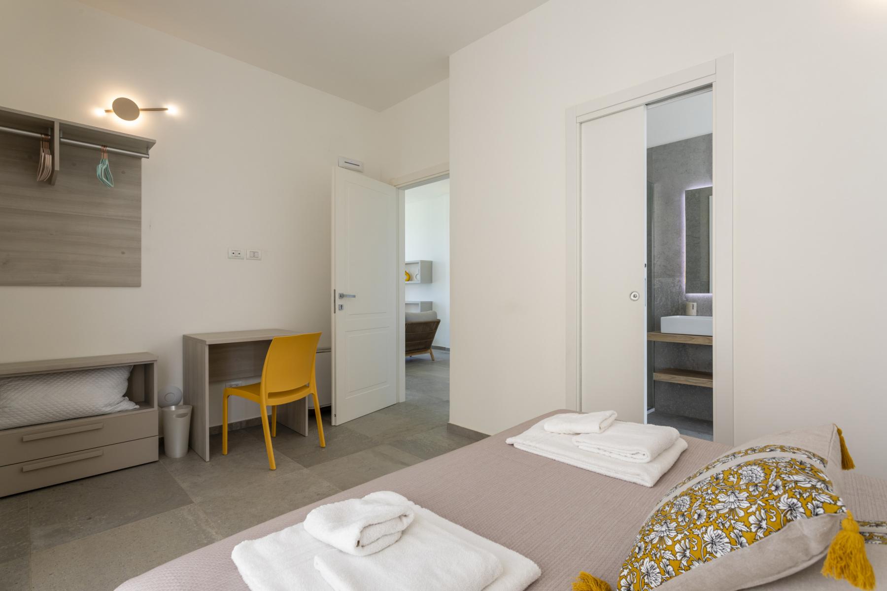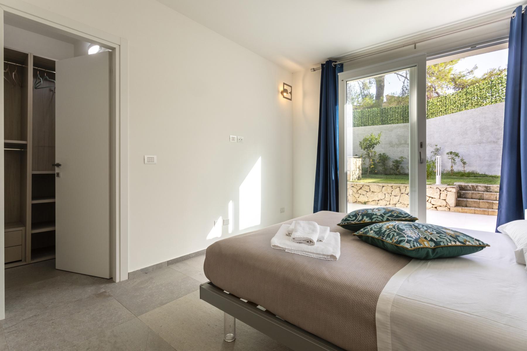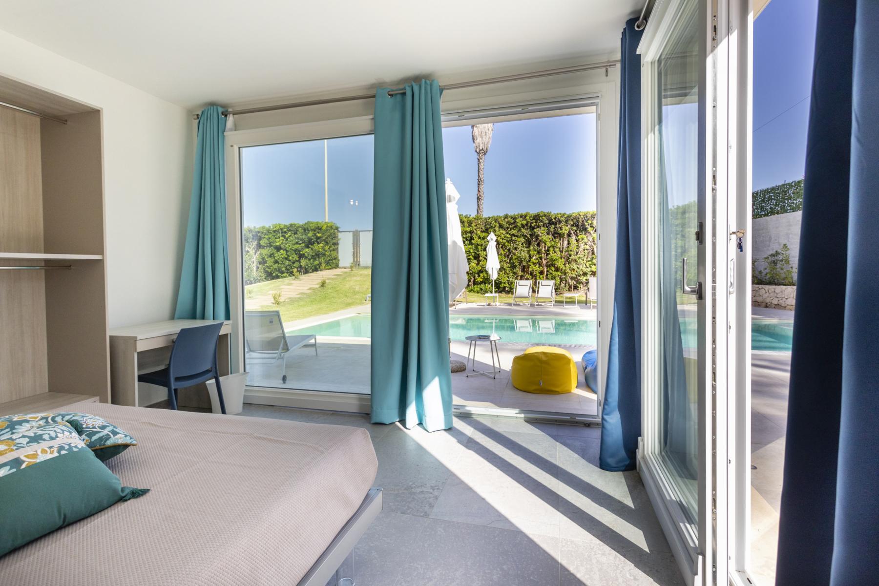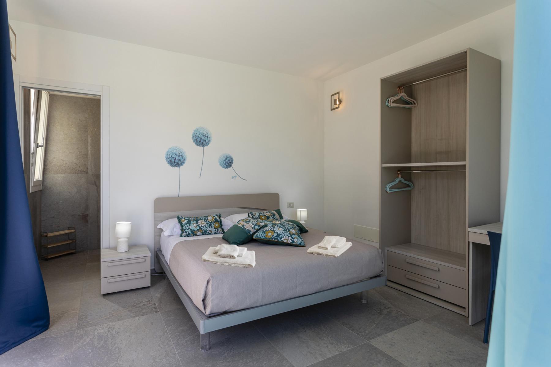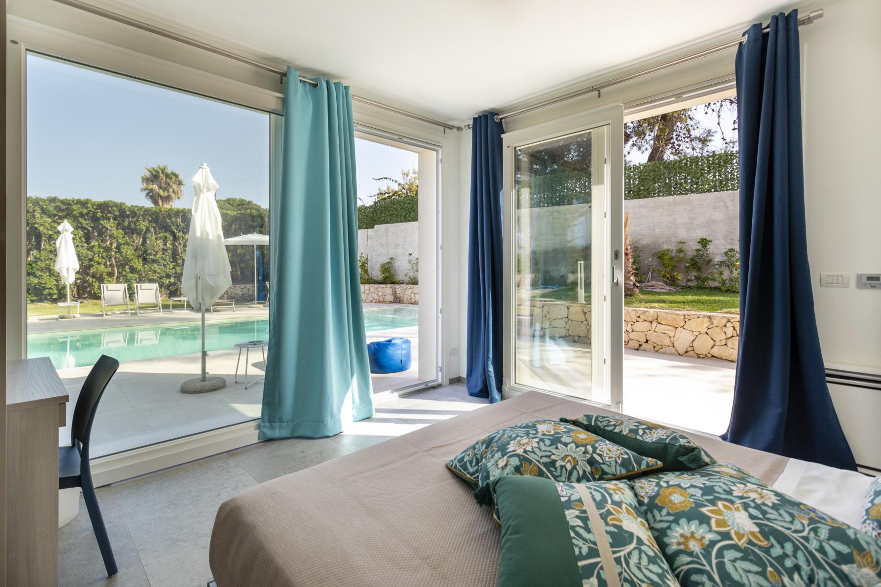 4 der Schlafzimmer befinden sich im Erdgeschoss und haben alle einen Eingang von außen: Das erste, an die Küche angrenzend, ist direkt vom Parkplatz aus zugänglich; Die anderen drei sind stattdessen vom Poolbereich aus zugänglich.